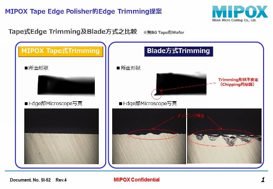 市場日漸成長的Power Device及手機端末應用產品多使用高性能薄化Chip,Wafer薄化製程不可缺少,特別是100u以下薄化製程必須先做Edge Trimming,本公司獨特的Tape Edge Polisher擁有Edge Trimming優勢,可減少Edge Chipping造成的Wafer破裂及裂痕,提高薄化製程之良率