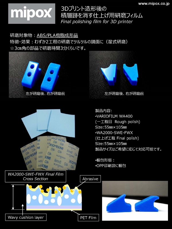 MIPOX提供3D列印成型品(ABS/PLA樹脂)之修整方案,使用研磨片去除積層印刷痕跡,歡迎業界洽詢。
